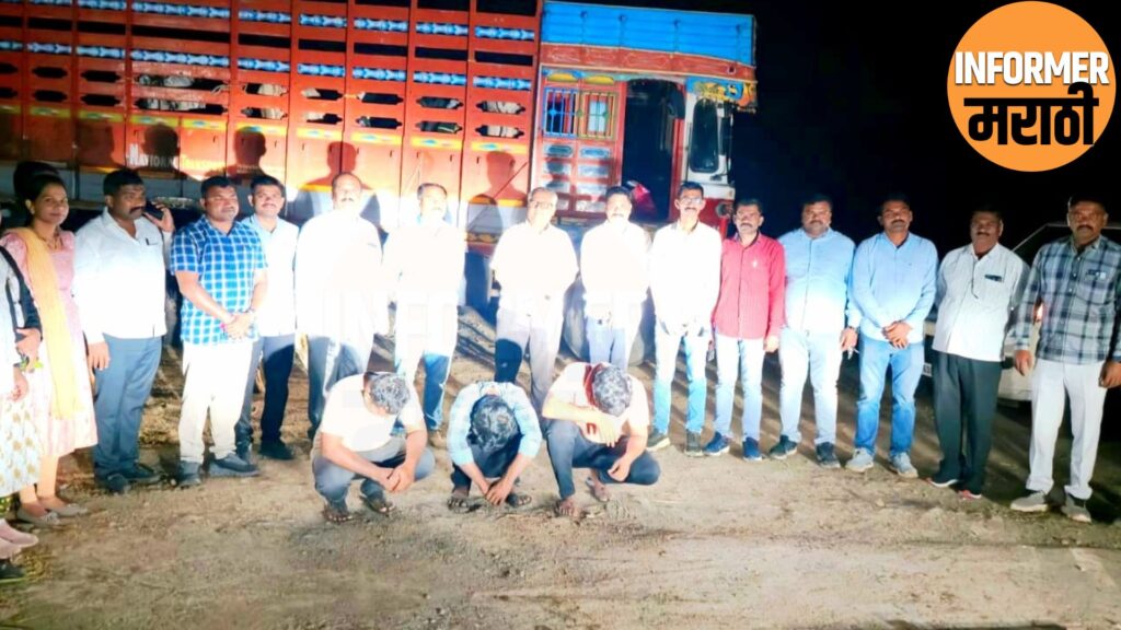 आरोपींकडून 33 लाखांचा मुद्देमाल जप्त स्थानिक गुन्हे शाखेची कारवाई गुन्हेअन्वेषण विभागाचे किरण कुमार कबाडी यांना गुप्त बातमीदारामार्फत सोनई पोलीस स्टेशन हद्दीत घोडेगाव गावचे शिवारातील शेख वस्ती या ठिकाणी फिरोज शेख हा आणि त्यांचे साथीदाराचे मदतीने महाराष्ट्र राज्यामध्ये गोवंशीय जनावरे कत्तल करण्यास मनाई असताना त्याने काही जनावरे कत्तल करण्याच्या उद्देशाने आणून बिना चारा पाण्या वाचून दाबून ठेवले असून सदर जनावरे ट्रकमध्ये भरून कत्तल करण्यासाठी घेऊन जाणार असल्याची माहिती मिळाली होती. सदर माहितीचे अनुषंगाने स्थानिक गुन्हे शाखा येथील पोनी किरण कुमार कबाडी , सपोनी/हरीश भोये, पोलीस अंमलदार रमेश गांगर्डे, हृदय घोडके, लक्ष्मण खोकले, गणेश लोंढे, संतोष खैरे, सुयोग सुपेकर, सोमनाथ झांबरे, श्यामसुंदर जाधव, भीमराज खरसे, भाऊसाहेब काळे, अमोल कोतकर, जालिंदर माने, प्रमोद जाधव, उमाकांत गावडे , अरुण मोरे, सारिका दरेकर, सुवर्णा गोडसे, यांची स्वतंत्र तीन पतके तयार करून सदर पथकासह घोडेगाव ते सोनई जाणारे रोड लगत, शेख वस्ती या ठिकाणी जाऊन खात्री करता काही इसम एका ट्रकमध्ये गोवंशीय जनावरे भरताना दिसून आले. सदर इसमांकडे जात असताना जनावरे भरणारे इसम पोलीस पथकास पाहून पळून जाऊ लागले. सदर इसमांचा पाठलाग करून त्यातील तीन जणांना ताब्यात घेऊन त्यांना त्यांचे नाव विचारता त्यांनी फिरोज रशीद शेख ( वय ३६ वर्ष), रा.घोडेगाव , लाला उर्फ अफताब हरून शेख (वय २८) रा.सदर, शुभम बाळासाहेब पुंड ( वय २५) रा. माळीचिंचोरा,. असे असल्याचे सांगितले. त्यांच्याकडून पळून गेलेल्या इसमान बाबत विचारपूस करता त्यांनी पळून गेलेल्यांची नावे भारत भाऊसाहेब शहाराव, रा.फत्तेपूर (फरार) , जुनेद शेख (पूर्ण नाव माहित नाही) रा. मुंगी ता. शेवगाव (फरार) असे असल्याचे सांगितले. ताब्यात घेण्यात आलेल्या इसमांचे कब्जामध्ये 13 लाख रुपये किमतींची 26 जिवंत गोवंशय जनावरे वीस लाखांचा एम. एच.११ सी. एच ८५९९ या क्रमांकाचा ट्रक असा एकूण 33 लाख रुपये किमतीचा मध्यमाल हस्तगत करण्यात आला.